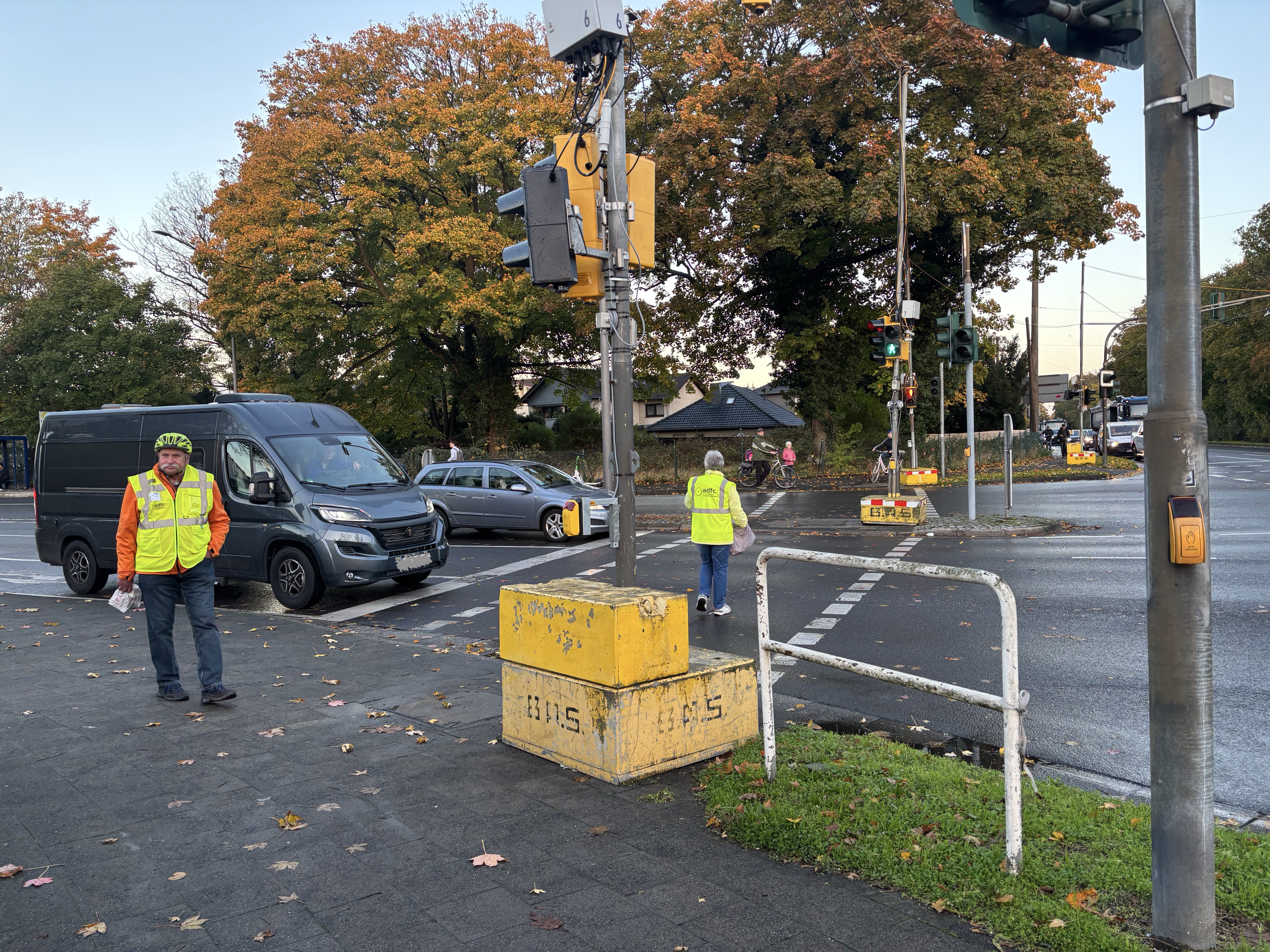 Langenfeld, 30. Oktober 2025. Morgens, kurz nach halb acht Uhr: Während sich auf den Hauptstraßen die Autoschlange langsam in Bewegung setzt, herrscht an zwei Kreuzungen mit der Düsseldorfer Straße (L219) eine entspannte Atmosphäre. Zwischen Musik, freundlichem Lachen und dem Duft frischer Brötchen verteilte der ADFC Langenfeld/Monheim kleine Geschenktüten an Radfahrerinnen und Radfahrer – gefüllt mit Schokomürbchen der Bäckerei Pass, einem Flyer mit Infomaterial zu den nächsten ADFC-Radtouren und einem herzlichen Dankeschön.