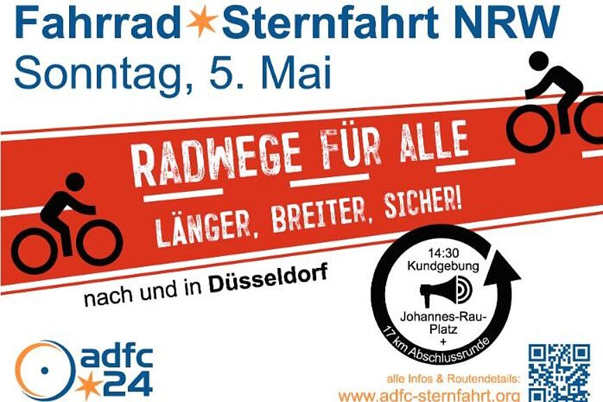Von über 40 Startpunkten aus führt die ADFC-Sternfahrt NRW 4000 Radfahrer/innen in die Landeshauptstadt, um für ein fahrradfreundliches NRW zu demonstrieren. Der Zubringer von Langenfeld startet um 11:45 Uhr an der Stadthalle. Vom Treffpunkt an der Rosenapotheke in Monheim-Baumberg wird um 12 Uhr gestartet.