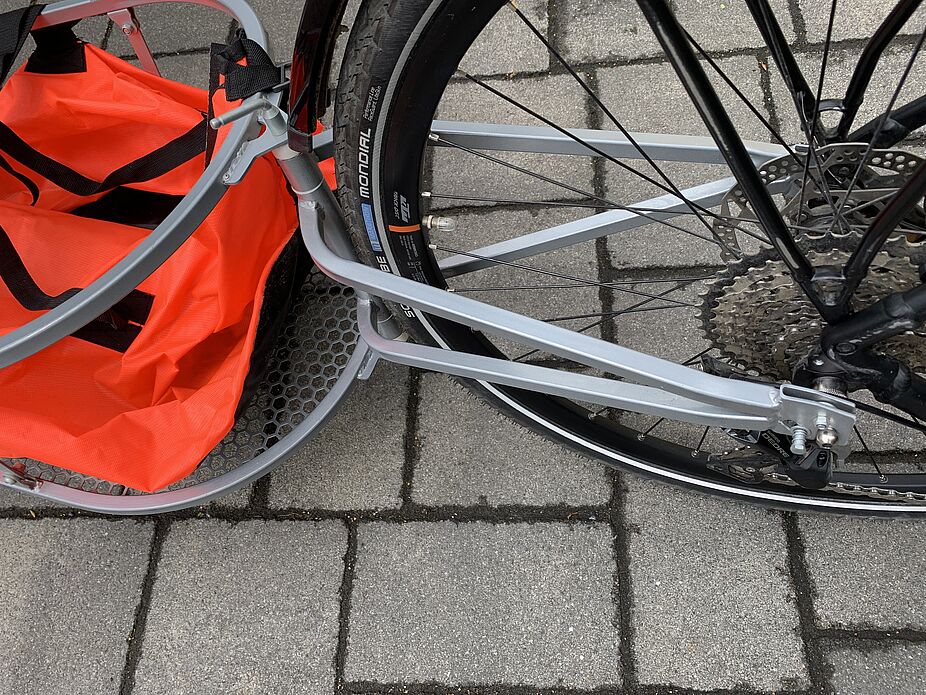 Und die Montage ist ein Kinderspiel, die Originalachse mit Schnellspanner wird gegen eine Achse mit Aufnahme für den Anhänger getauscht. Diese verbleibt immer am Rad. Der An und Abau vom Anhänger ist in Sekundenschnelle vollzogen.
